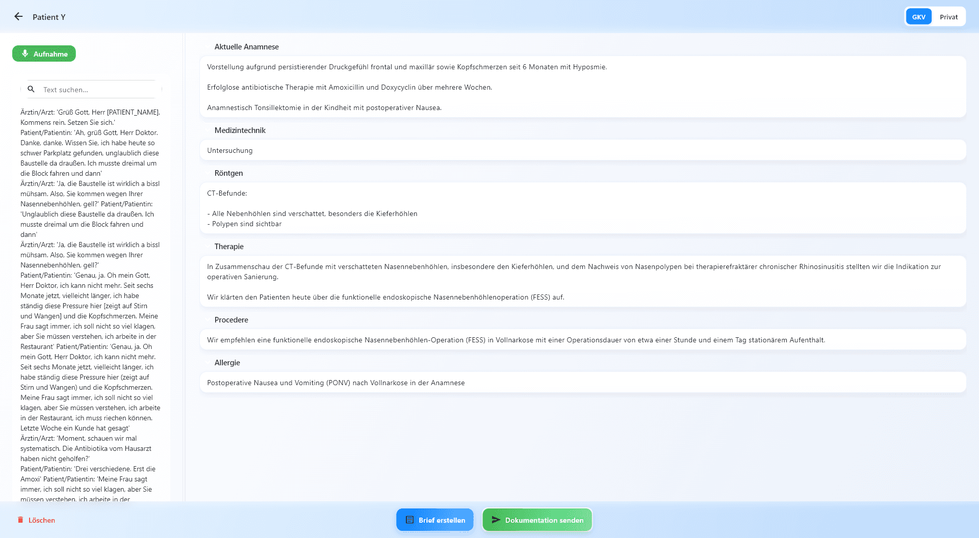 Alles Gesprochene wird innerhalb von 2-3 Sekunden in Text verwandelt und automatisch in Kategorien wie Untersuchungsbefund oder Anamnese unterteilt - kontinuierlich während des Gesprächs.